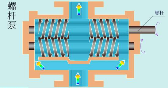 雙螺桿泵與齒輪泵十分相似,一個螺桿轉動,帶動另一個螺桿,液體被攔截在嚙合室內,沿桿軸方向推進,然后被擠向中央排出。