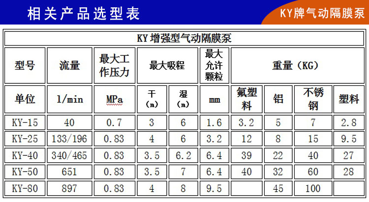 7、KY鋁合金氣動隔膜泵無需潤滑,沒有潤滑劑污染物料之憂