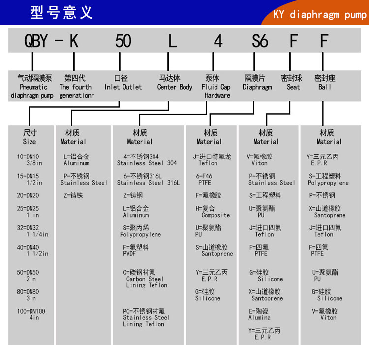 QBY-K50LC第四代qby氣動隔膜泵廠家—上海楷陽泵業經過研發改進,產品有了更完美的輸送效果。內襯氟氣動隔膜泵以優質鑄鋼A2為外殼,具有良好的物理性能,以特氟龍F46聚全氟乙丙烯(性能超越四氟)為內襯材料,可適用于除熔融態堿鹽以外的任何酸、堿及各類有機溶劑,應用范圍極其廣泛。內襯氟qby氣動隔膜泵具有結構美觀,良好的物理抗性,經久耐用等特點,對于各種腐蝕性液體、帶顆粒、高粘度、易揮發、易燃、易爆、劇毒的液體均能予以抽光吸盡,尤其可以解決葉片式泵的跑、冒、滴、漏及不允許空轉等問題。上海楷陽生產的QBY-K50LC氣動隔膜泵液體經過的部分全部使用四氟,請廣大新老客戶放心使用: